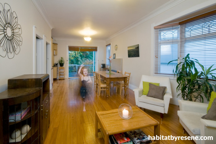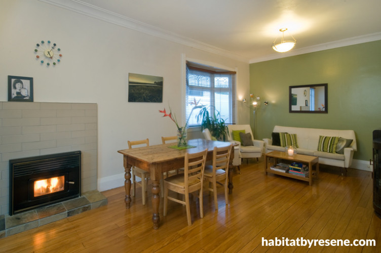 The yellow walls were quickly painted over with Resene Merino "which brightened it up fantastically", but finding the right shade for a feature wall in the living room was not so easy. "We knew it needed to be green, but choosing the right green was the hardest part! It had to work with the greens in the garden, but there were so many different ones, some blue-based and some yellow-based. It took a lot of looking at samples in different lights of day, before we found the right one."