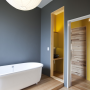 The sculptural form of a free-standing bath looks superb framed by walls finished in Resene Gravel. Through the door, a children’s vanity area is finished in Resene Wazzup yellow. The interiors were designed by Peta Davy of Yellowfox.