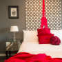 Resene Quarter Fuscous Grey is accessorised with bright red for this moody bedroom designed by Annabel Berry of Design Federation.