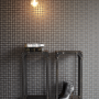 A small geometric pattern enlivens this dark grey wallpaper from the Eijffinger Lux collection available at Resene, and enhances the vintage industrial look of the setting.