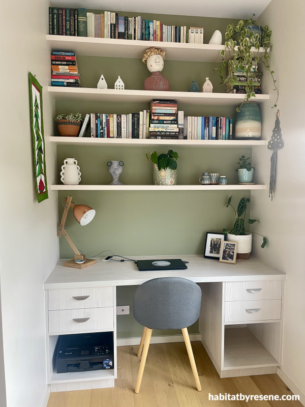 Inside, walls are painted in Resene Half Fossil, with trims and doors in Fossil and ceilings in Alabaster. The soft olive green of Bitter appears in the entrance foyer, office nook and family bathroom.