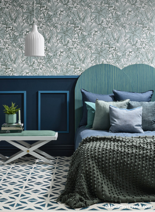 A mix of bold patterns and layers of throws and cushions, create a welcoming comfortable guest bedroom that could belong in any luxury hotel. The upper walls are Resene Wallpaper Collection 37520-2 and the lower wainscoting is Resene Tangaroa with battens and dado rail in Resene St Kilda. Stencilled floor painted in Resene Rice Cake with design in Resene FX Paint Effects medium mixed with Resene Tangaroa. Bench seat in Resene Stromboli with legs in Resene Duck Egg Blue, headboard in Resene Cashmere, pendant light in Resene Scoria and plant pot in Resene Duck Egg Blue. Project by Kate Alexander, image by Bryce Carleton.