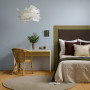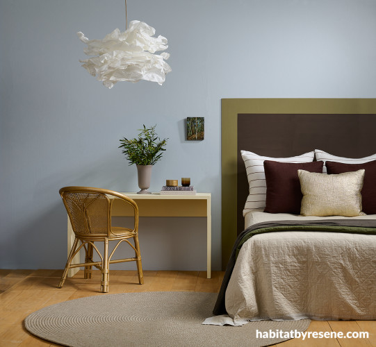 The cloud light is a standout design feature of this bedroom, with an added practical purpose of lighting up the working space. Bedroom walls painted in Resene Half Gull Grey, while the floor is stained in Resene Colorwood Natural. Desk painted in Resene Colonial White, chair in Resene Gold Dust metallic, headboard in Resene Lignite with a border in Resene Go Ben. and vase in Resene Americano. Project by Kate Alexander, image by Bryce Carleton.