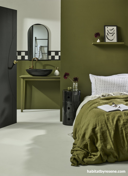 An ensuite or nearby bathroom ensures ultimate convenience for your guests. This bedroom and lower ensuite wall are painted in Resene Waiouru. Upper ensuite wall and white faux tiles in Resene Eighth Black White with black tiles in Resene Nero, shelf and ensuite table in Resene Waiouru and door in Resene Nero. Project by Melle van Sambeek, image by Bryce Carleton.