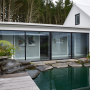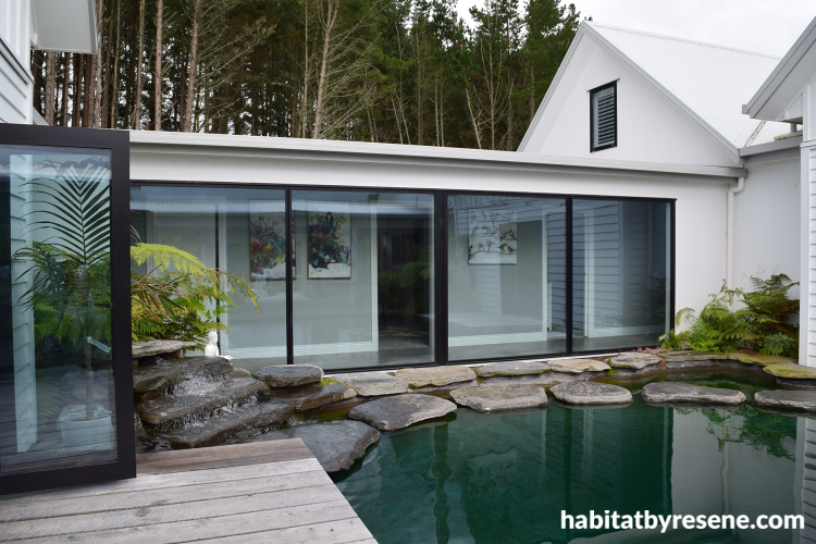 A tranquil pond lies in the middle of the Sakura property. Get this exterior look with Resene Double Sea Fog. The roof is painted in Resene Gull Grey.