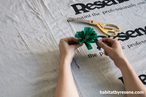 Step 4 Cut your green crepe or tissue paper into long strips. Stack one on top of another, then roll up the two strips together. Using your scissors, insert one blade inside the end of the rolled up tube and clip approximately halfway down six or more times. Holding the bottom of the tube together firmly with one hand, fluff and pull apart the cut end of the crepe paper so that it resembles leafy greens.