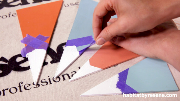 Step 4 While your main coloured pieces are drying, paint your smaller right triangles. We used two coats of Resene Japonica for one and two coats of Resene Gulf Stream for the other.