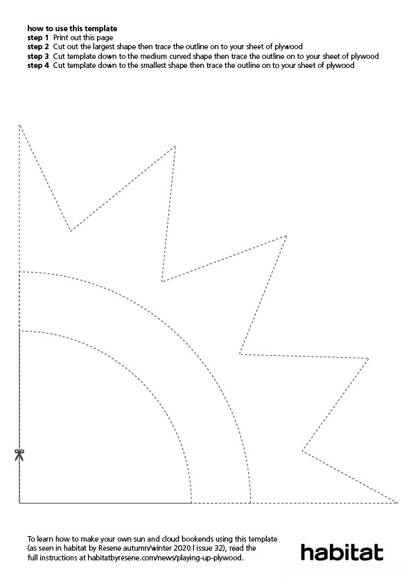 Step 1 Cut out the bookend templates (download below) using scissors then trace the shapes onto plywood with a pencil. To conserve paper, cut out the largest sun/cloud shape first, trace it on to the plywood, then cut into the template around the medium shape, trace it, then do the same with the smallest shape.