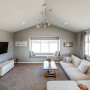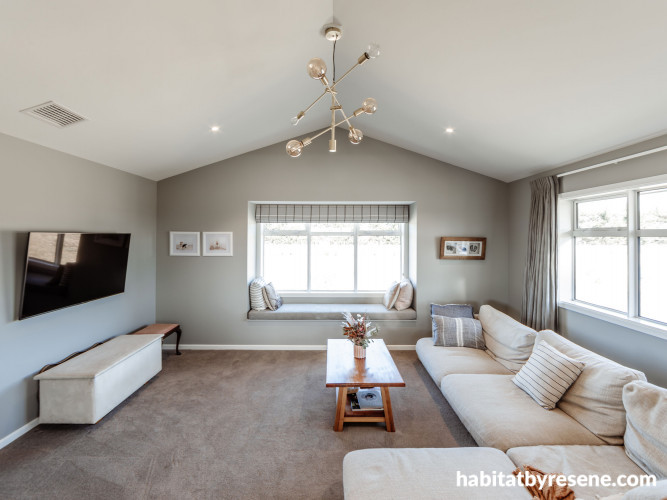 Sarah and Nick captured a warm and comforting atmosphere in the second lounge with rich Resene Foggy Grey from the Karen Walker Paints collection on the walls. The ceiling and trim provide a crisp outline in Resene Rice Cake.