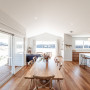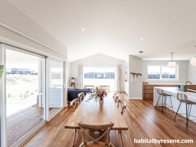 The open plan kitchen, living and dining area create a haven of light and flow beautifully thanks to the calming Resene Double White Pointer on the walls and crisp Resene Rice Cake on the ceiling.