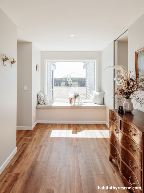 A cosy nook in the entranceway provides the perfect place for the family’s dog Wilson to gaze out at the surrounding countryside. The walls are in Resene Double White Pointer and the ceiling and trim are in Resene Rice Cake.