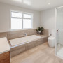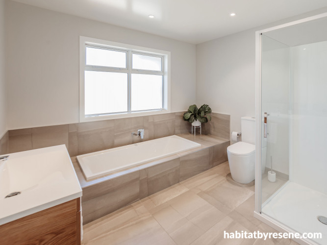 Sarah and Nick went for a minimalist approach in the bathroom. The bathroom features are highlighted by the walls in Resene Double White Pointer and ceiling in Resene Rice Cake.