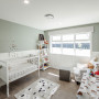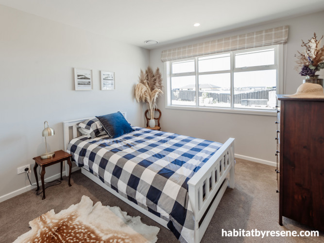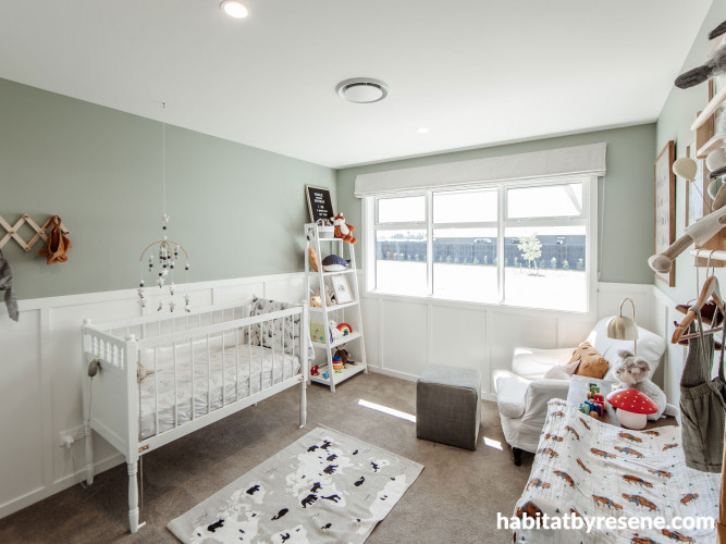 In the nursery, Charlie’s delicately fashioned cot is complemented by crisp Resene Rice Cake on the ceiling, trim and board and batten panelling. The wall above the panelling is in Resene Robin Egg Blue from the Karen Walker Paints collection, a pebble grey with a splash of Hamptons dusty blue.