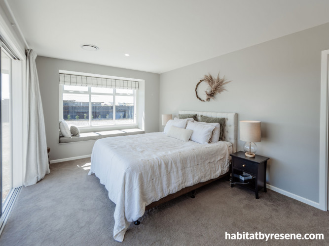 Sarah carried the simplistic and elegant atmosphere of the lounge into the master bedroom, where she painted the walls stone grey in Resene Half Foggy Grey from the Karen Walker Paints collection. “We wanted to create different moods in different areas of the home which is why we chose Resene Foggy Grey in the separate lounge and Resene Half Foggy Grey in the master bedroom to create a cosier feel,” says Sarah.