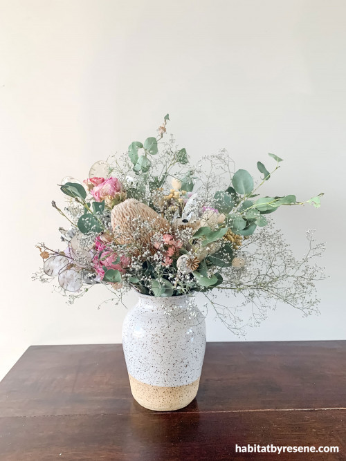 Sarah uses the Resene Double White Pointer walls in her dining room as a backdrop for photos of her beautiful blooms for her dried flower business Mama Bloom.