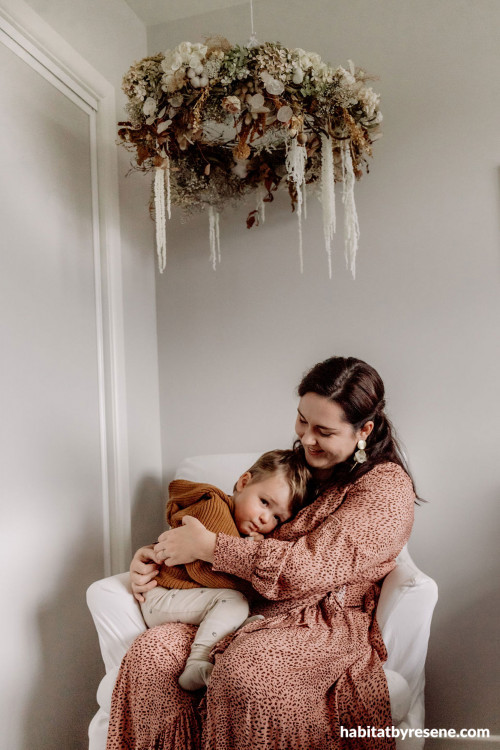 Sarah and Charlie snuggle up in the second lounge which has a relaxing comfortable atmosphere thanks to its soft off-white furnishings and neutral colour palette of Resene paints. The walls in Resene Foggy Grey from the Karen Walker Paints collection and trims in Resene Rice Cake complement one of Sarah’s dried floral wreaths.