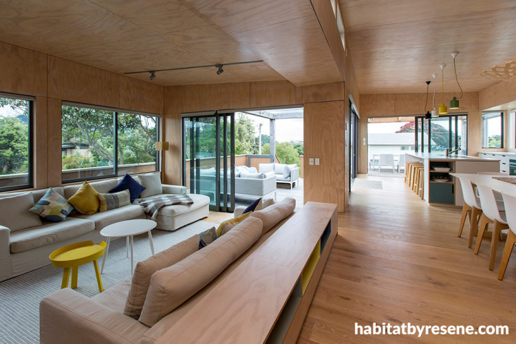 The colour accents extend to storage along the living room, painted in Resene Half Washed Green, Resene Half Smalt Blue and Resene Moonbeam. The plywood is finished in Resene Colorwood Whitewash.