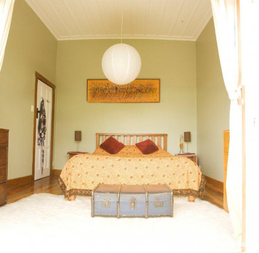 Their favourite space is the main bedroom, which was originally painted a pale blue. After stripping back the floors, window surrounds and skirtings, and putting in French doors, they chose the restful green of Resene Coriander to tie the room to the outdoor setting. The painting is by New Zealand-based artist David Weir, says James. “His work is very centred and earthy, incorporating the spirit of the earth and elements. We have a few of his pieces around the house but this is the largest and my favourite. Our children are fascinated by the dancing figures they see in it; it’s just bursting with life.”