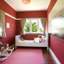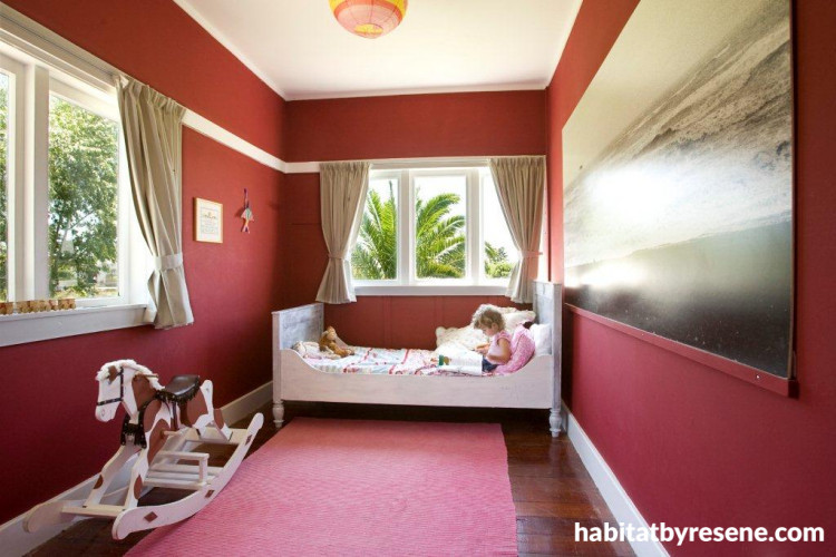 For their elder daughter’s room, James and Naomi chose Resene Pohutukawa, a deep, warm shade of red that plays off well against the black-and-white artwork, white furniture and pink rug.