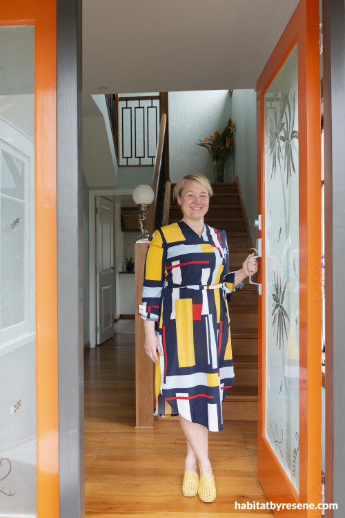 Here’s a challenge: Stop smiling as you walk up to Ann and Matt’s home. The exterior is painted in elegant Resene Double Malta, teamed with a front door in Resene Rock Spray, a fiery orange ensuring a bright and cheery entrance to this Ngaio deco-style home. “I wanted people to smile and go, ‘Oh!’” says Ann, sitting in a favourite spot in her Resene Streetwise living room. “I wanted to give visitors a clue they are about to enter a colourful world.”