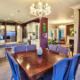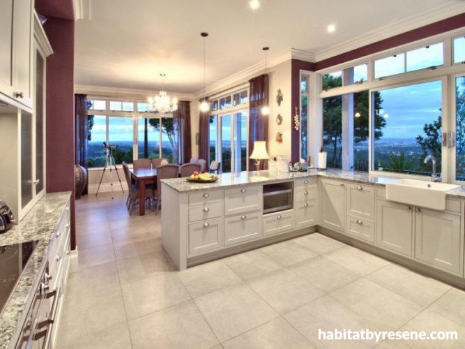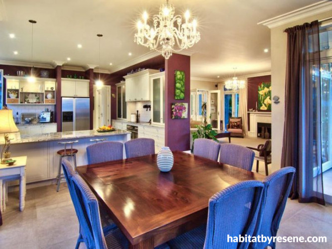 The kitchen bench is Brazilian granite in Azul Arun. The cabinets are Resene Quarter Napa, while the kitchen walls are Resene Fandango and the dining room walls are Resene Pearl.