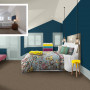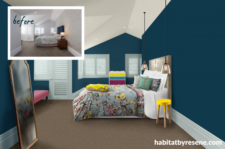 Designer Sandra Carroll turned this neutral bedroom into an edgy space with Resene Barometer walls and chest of drawers in Resene Bright Lights (yellow), Resene Dauntless (teal) and Resene Smooch (pink).