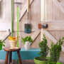 Colours used here are Resene Colorwood Rock Salt to blonde the doors, and pots and tool handles in Resene Duck Egg Blue, Resene Wimbledon and Resene Wishlist. The bench is in Resene Wishlist.
