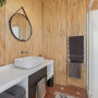The plywood walls in the bathroom are finished in Resene Qristal Clear polyurethane satin varnish.