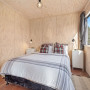 The master bedroom has been given a rustic cottage look with plywood walls finished in Resene Colorwood Rock Salt whitewash and window trim in Resene Half Black White.