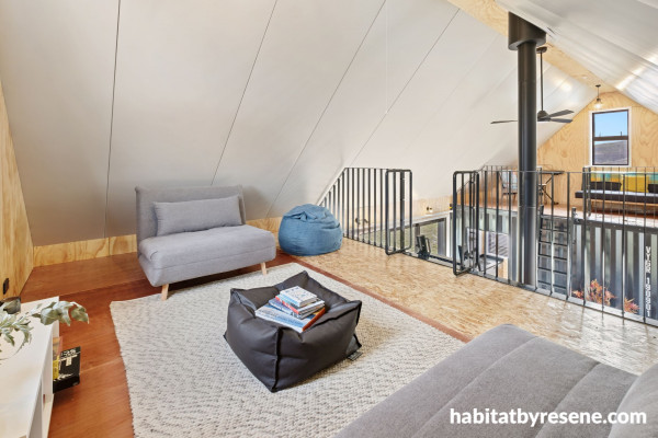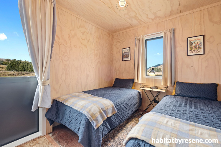 The couple used two shipping containers and self-supporting sandwich roofing panels to create a comfortable home for their family of four, incorporating two large loft areas into the 65-metre-square floor plan. The family lived in the cabin for an extended trial period, before Shanon and Shelley launched it as accommodation for cyclists completing the Clutha Gold Cycle trail.