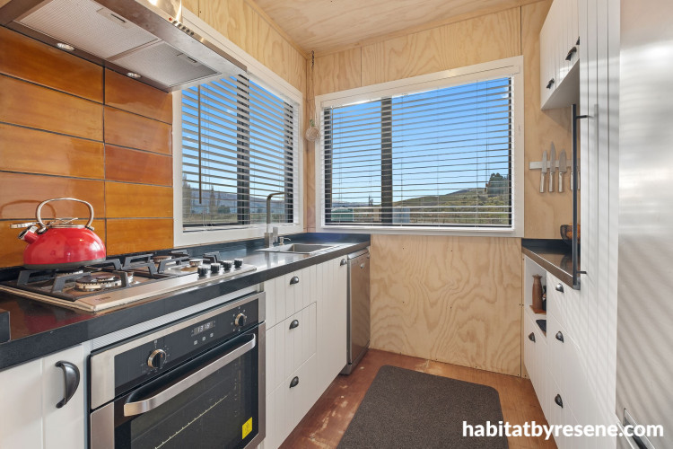 The plywood walls in the kitchen are finished in Resene Qristal Clear polyurethane satin varnish and the floor is in Resene Aquaclear.