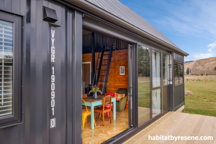 One of the small touches the couple love is the VYGR 190909 code stencilled onto the container – a reference to the Voyager Cabin name and the date the container was shipped to them. The roof is in COLORSTEEL ® Sandstone Grey and the exterior wall is in a custom black grey created by their local Resene ColorShop, similar to Resene Fuscous Grey. The deck is finished in Resene Woodsman Natural.