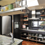 Black cabinetry, stainless steel fridge and shelves, marble counter and polished wood floors create a sophisticated kitchen look.