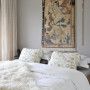 A sheepskin on the bed and tapestry on the wall give the master bedroom a warm and cosy look.