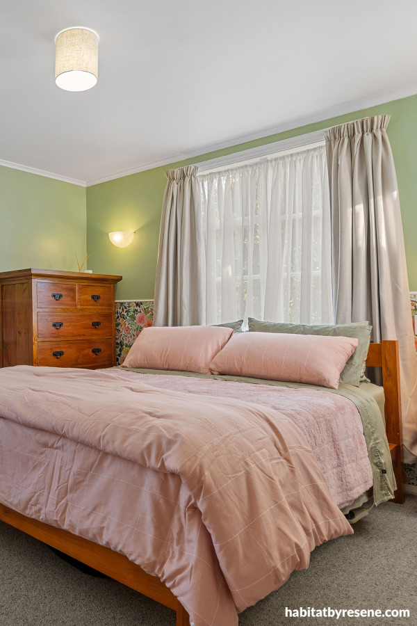 Echoing the rolling greenery outside, the bedroom offers a calming, natural tone with the soft pastel of Resene Norway and mid-century touches.