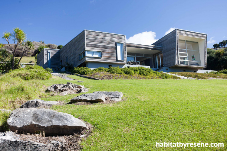 Designed by Aaron Sills and Jill Shepherd, the three-bedroom house (with a separate one-bedroom guesthouse) has a deceptively simple style, opening on all sides for maximum indoor-outdoor flow. The cedar exterior has naturally faded over time and now has a weathered appearance that seems right at home by the sea, alongside pancake rocks and gnarled pohutukawa trees.