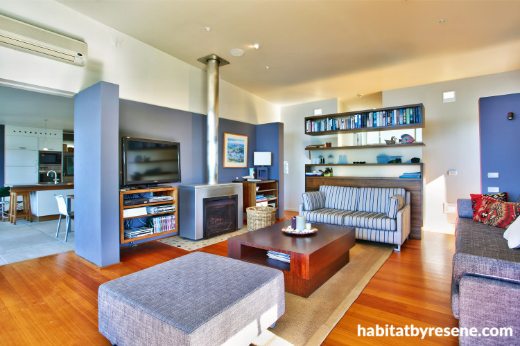Painted Resene Bermuda Grey, the living room is Julie's favourite space in the house: "It works whether the kids are playing, we’re having coffee, or sitting around the (real) fireplace."