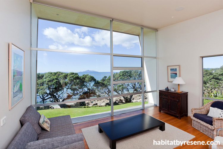 "The windows are so dominant that the arrangement of the room needed to be well thought-through," says Julie of the living room. This end of the room, nearest the windows, is painted in Resene Alabaster.