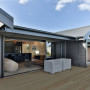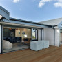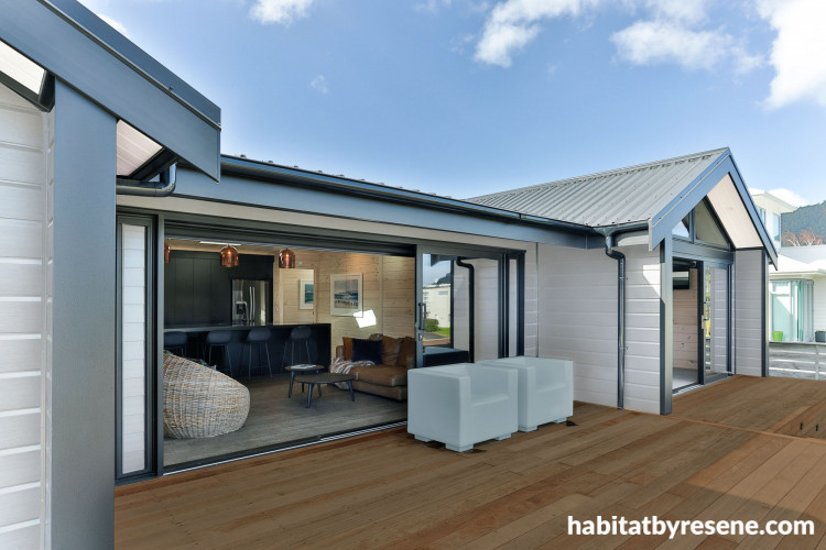 Make your spouting and downpipes a design feature by pairing Marley Stratus Design Series® Typhoon® spouting with RP80® downpipes in Black with lighter contrasting weatherboards in Resene Double Silver Chalice. Tie in grey tones on the soffits in Resene Sea Fog, an off white with a touch of grey and add a hint of blue with Resene Bluff on the chairs. Keep the decking soft and natural with Resene Woodsman Natural.