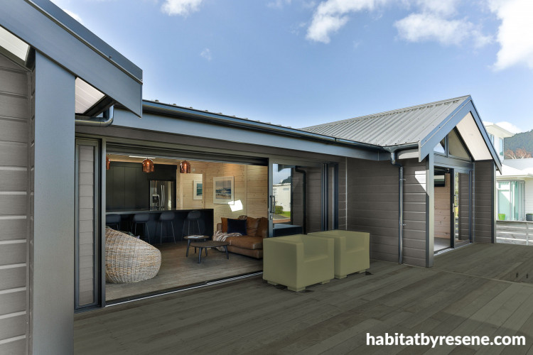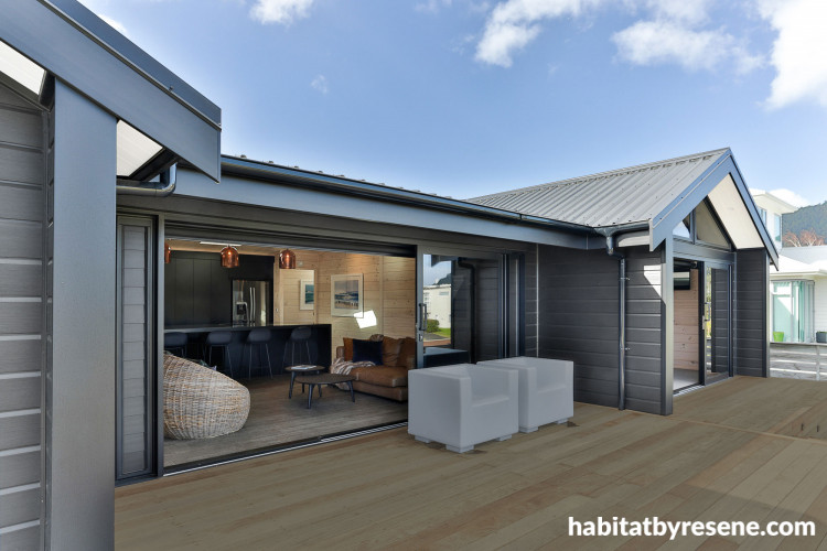 For dark architectural style, pair Marley Stratus Design Series® Typhoon® spouting with RP80® downpipes in Black with weatherboards in Resene Double Foundry. Resene Double Foundry and other dark Resene colours are available in Resene CoolColour versions meaning they contain special heat-reflective technology that stays cooler than the standard colour. Tie in lighter grey tones with chairs painted in Resene Raven, soffits in Resene Black White and deck in Resene Crowshead, a tar-coloured brown wood stain.