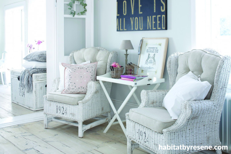 White wicker chairs with a date stencil, a wicker trunk, and a butler’s tray side. These and more are available from the Atwood range from Johnston Imports. Complete the look with Resene Colorwood Whitewash for the timber floors and Resene Alaska for the walls.