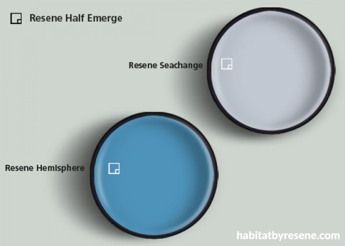 Or Resene Seachange, Resene Hemisphere and Resene Half Emerge for that gorgeous cross-over blue/green seawashed look.