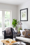 Kate has added earth-toned colours to her living room through furniture and accessories, including her cane chair painted in Resene Blackjack and stool in Resene True Blue. Walls in Resene Black White and ceiling and trims in Resene Alabaster.