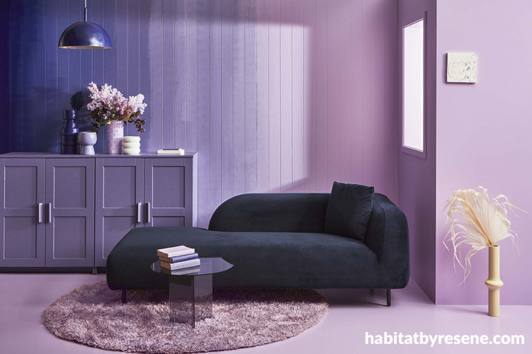 Who said sophistication can’t be colourful? Create a visual statement with an ombre feature wall that instantly attracts the eye. Its unique design allows you to incorporate multiple colours in the space, seamlessly blending them together. This feature wall puts a modern twist on deep royal purple with an ombre wall in Resene Paua, Resene Covert and Resene Wonderland. Begin your luxe ombre design with a dark colour to ground the space such as Resene Paua, an electric violet blue, then simply use Resene FX Paint Effects medium mixed with your desired colours to continue the design. Bring texture into the room with multiple rugs or painted vases for a striking addition to any home.