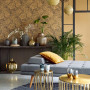 A radiant and elegant atmosphere is created in this sitting room with Resene Wallpaper Collection E378010 on the wall. Pair your feature wall with surrounding walls in Resene Putty and painted vases in Resene FX Metallic Gold Dust.