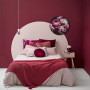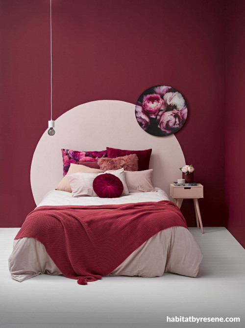 Red on red has never looked better in this luxe bedroom with walls in Resene Pohutukawa, circle feature in Resene Dust Storm and floors in Resene Double Rice Cake. The bedside table is in Resene Sakura with vase in Resene Pohutukawa. Project by Vanessa Nouwens. Image by Melanie Jenkins.