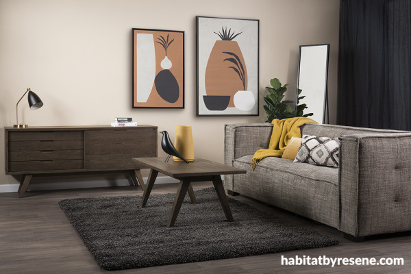 Resene Biscotti on the main wall area complements an Austin Sideboard in Smoke, Nod Desk Lamp, Monty Shag Rug in Anthracite, Austin Coffee Table in Smoke, Replica Eames Bird in Black, Taper Vase in Mustard, Immerse 2 Seat Sofa in Charcoal, Potted Desert Rock Framed Canvas, Potted Desert Framed Canvas, Avril Standing Mirror in Black, Mellor Weave Throw in Old Gold, Askam Velvet Cushion in Old Gold and Diamond Fringe Cushion in Light Grey, all from Nood.