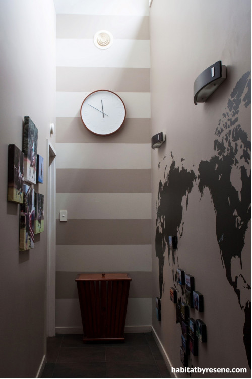 Meg hand-painted the Resene Tea and Resene Half Oilskin stripes in the hallway. On the side walls which are Resene Half Oilskin is a world map which features photos of the family’s travels on it. To make a wall like this magnetic, use Resene FX Magnetic Magic as a basecoat before applying your topcoat.
