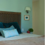 The master bedroom has a tropical theme with a feature wall of breezy blue Resene Hermitage and Resene Spanish White on the other three walls.