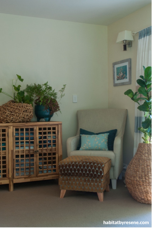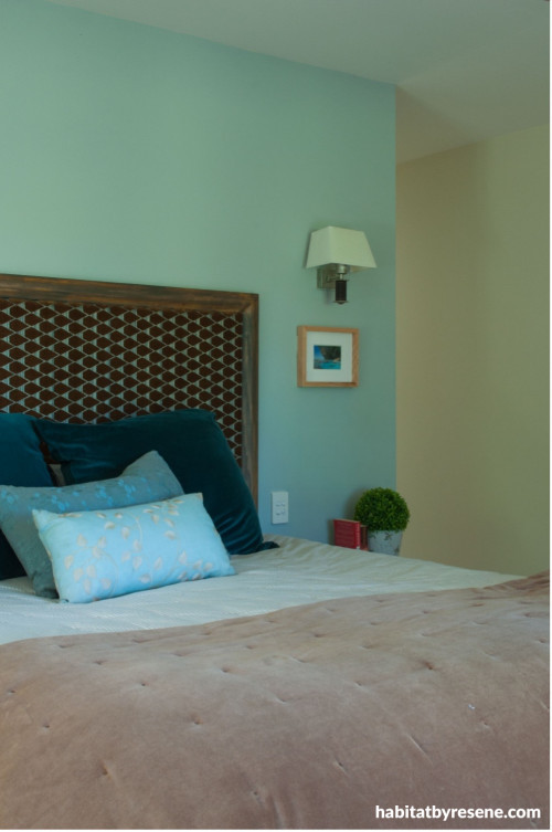 "I like to feel like I'm on holiday in my bedroom. With Resene Hermitage on the walls, the brown headboard and the rattan, it feels like we're in the tropics."